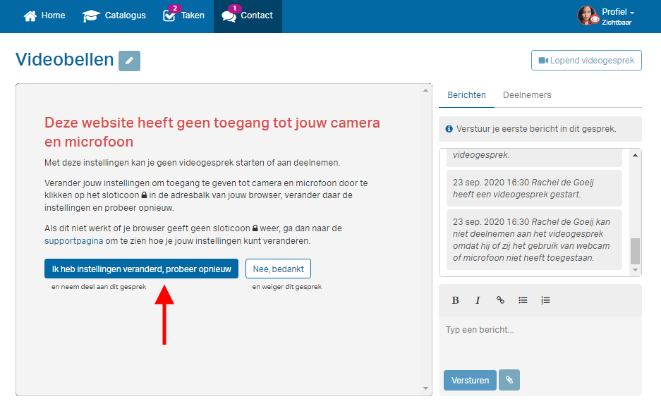 Niet elke organisatie biedt de optie tot videobellen. In dat geval zie je deze functie niet beschikbaar in jouw platform.Wil je meer weten over de videobelfunctionaliteit? Kijk dan hier.(Opent in nieuwe venster)