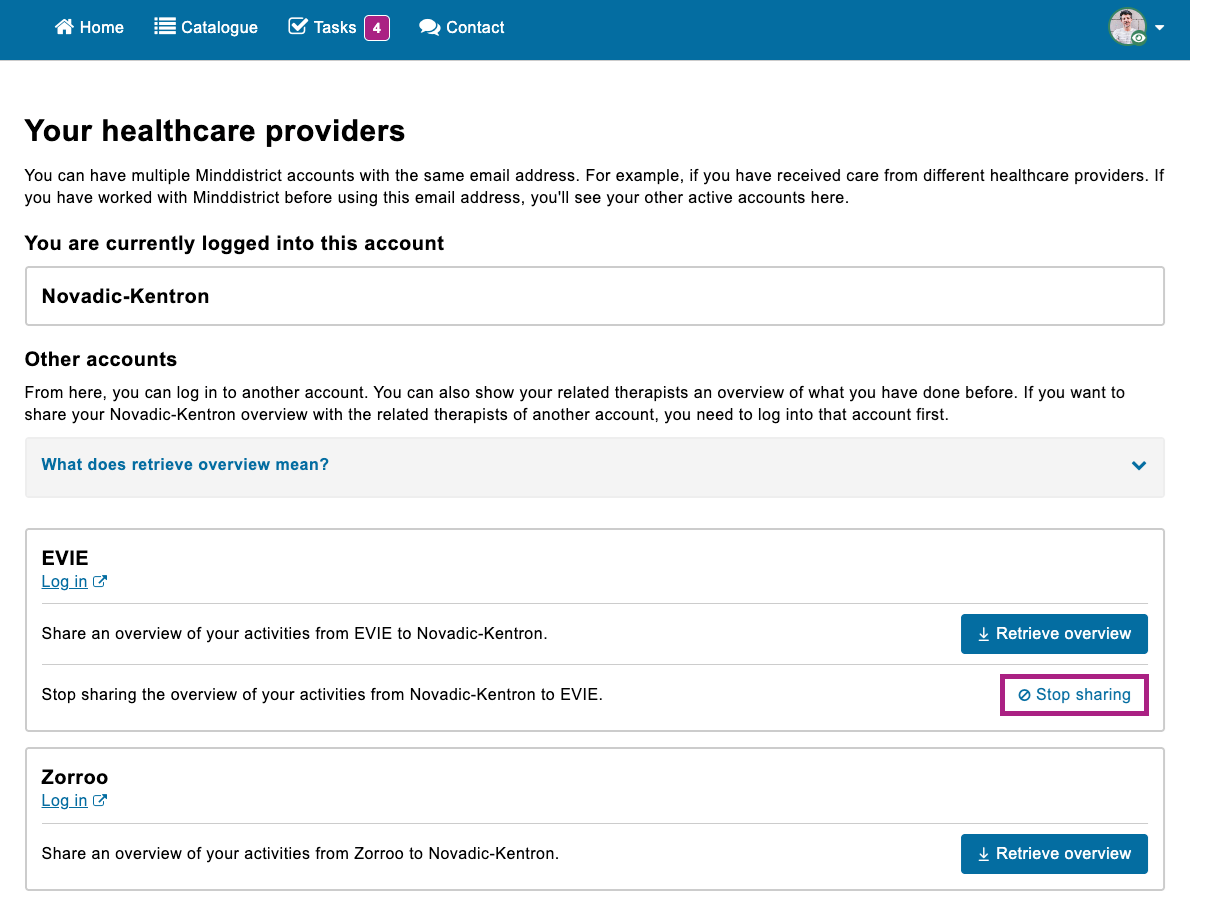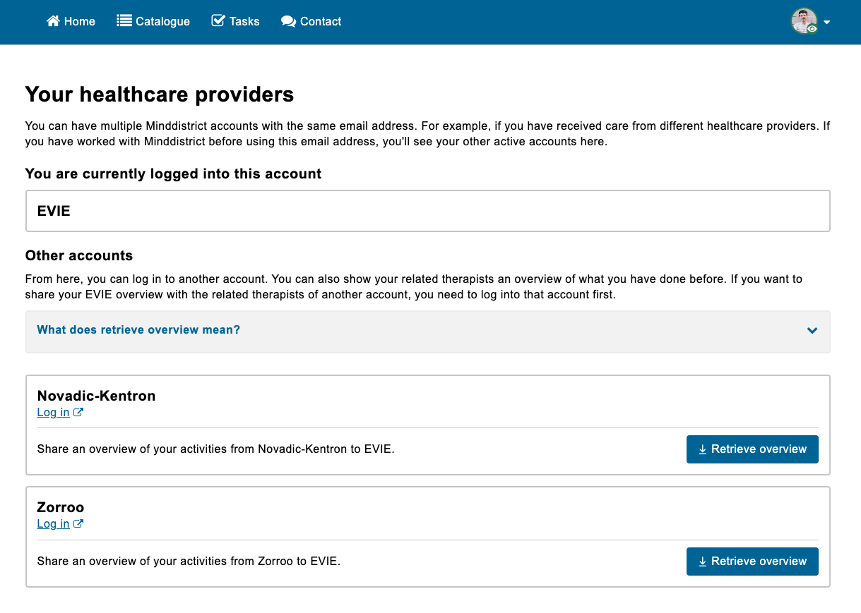 Ben je aangesloten bij meerdere zorgaanbieders waarop je een Minddistrict account hebt? Of heb je in het verleden bij een andere zorgaanbieder een Minddistrict account gehad die nog actief is? Dan kun je onder jouw profiel hiervan een overzicht vinden.