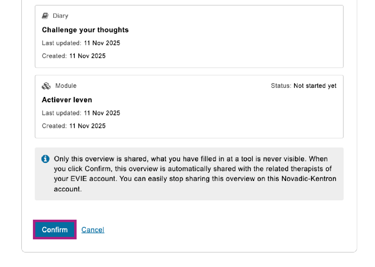 Als je nog geen tools in het overzicht hebt zitten kun je toch je activiteiten met je andere zorgaanbieder delen. Toekomstige tools zoals dagboeken en modules en de status ervan zullen dan zichtbaar worden voor de andere zorgaanbieder.